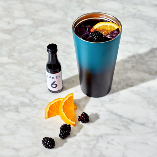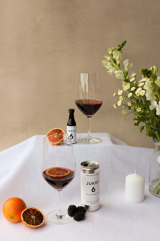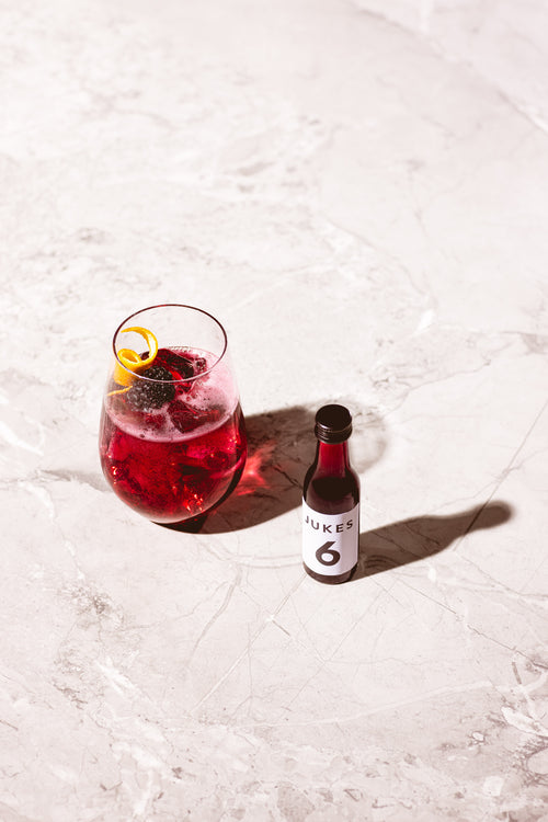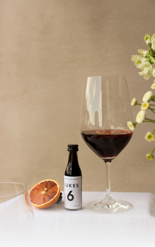 "With over 20 ingredients in Jukes 6 (the dark red), I have designed an alcohol-free drink with the same silhouette of flavor as a full-bodied, savory red. It’s available in two formats: as a concentrate, meant to be diluted with chilled still, sparkling or tonic water, and as a premixed sparkling drink, best served over ice."